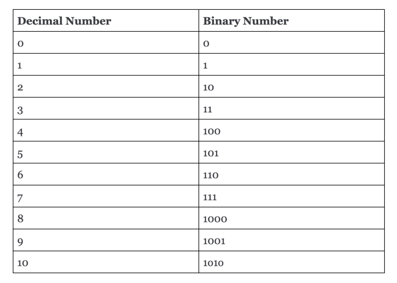 Here’s what binary numbers looks like in comparison to numbers 0 through 10 in decimal: